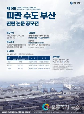 보훈복지뉴스 유서진 기자 | 부산시는 피란수도 부산유산의 세계유산 등재 추진을 널리 홍보하고, 이 분야의 미래세대 전문가를 양성하기 위해 ‘제6회 피란수도 부산 논문공모전’을 개최한다고 밝혔다.
