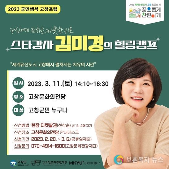 고창군은 11일 고창문화의 전당 공연장에서 오후 2시10분부터 스타강사 김미경 강사가 ‘당신에게 전하는 따뜻한 위로’를 주제로 군민 행복 고창포럼을 개최한다고 밝혔다.