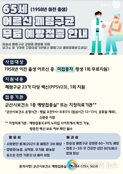접종대상은 1958. 12. 31.이전 출생자로 폐렴구균 다당질 백신(PPSV23)의 접종력이 없는 어르신이다. 해당 대상자는 군산시보건소(지소진료소) 또는 지정의료기관에서 접종 가능하다.