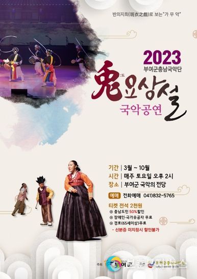 공연은 3월에서 10월까지(8월 제외) 매주 토요일 2시 부여국악의전당에서 열리며 티켓은 전석 2,000원이고 신분증을 지참한 충남도민이면 누구나 50% 할인 적용을 받을 수 있다. 자세한 사항이나 예매 문의는 부여군충남국악단 행정실로 전화하면 된다.