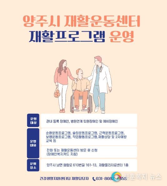 보훈복지뉴스 유서진 기자 | 양주시 보건소 재활운동센터가 지역사회 장애인의 일상생활 자립능력, 건강증진 향상에 기여하기 위해 ‘2023년 재활운동 프로그램’을 본격적으로 운영한다.