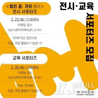 미디어아워 최지은 기자 | 대구미술관은 시민과 함께하는 열린 미술관 문화를 만들고자 ‘이건희 컬렉션 특별전’ 등 다양한 프로그램에서 활동할 전시·교육 서포터즈를 모집한다. 모집 기간은 ▲전시 분야 3월 23일(목) 17시까지, ▲교육 분야 3월 30일(목) 17시까지며 이메일 접수한다.