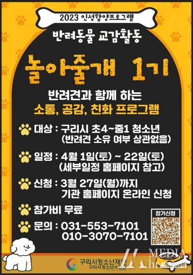구리시청소년재단 백경현 이사장은 “반려동물과 공생하는 환경조성에 앞장서고 있는 구리시의 청소년들이 이번 프로그램을 통해 정서안정과 올바른 인성을 함양할 수 있는 시간이 되길 바란다.”고 전했다.