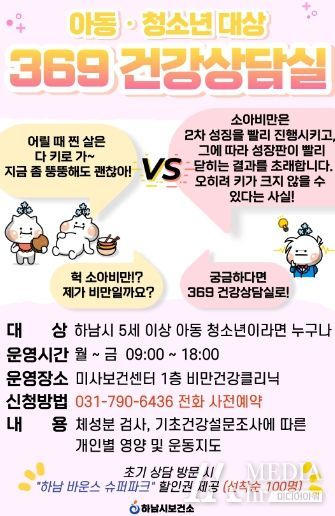미디어아워 최지은 기자 | 하남시는 오는 27일부터 ‘369 건강상담실’을 운영하며 아동·청소년기 소아비만으로부터 올바른 성장발달을 지원하기 위해 적극 나선다.