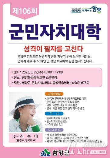 미디어아워 최지은 기자 | 함양군은 새봄을 맞아 오는 3월 29일(수) 오후 3시부터 5시까지 문화예술회관 소공연장에서 군민무료 교양강좌인 함양군민을 위한 제106회 군민자치대학을 운영한다.