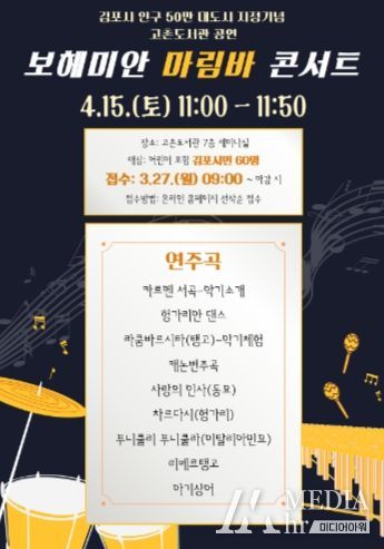 미디어아워 최지은 기자 | 김포시 고촌도서관은 김포시의 ‘인구 50만 대도시 지정’을 기념한 문화공연으로 4월 15일 토요일 오전 11시부터 약 50분간 고촌도서관 7층 세미나실에서 ‘보헤미안 마림바 콘서트’를 선보인다.