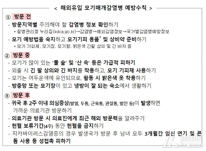 지영미 청장은 동남아 등 모기매개 감염병 발생 국가를 방문 계획하고 있는 국민에게 다음과 같이 해외유입 모기매개 감염병 예방수칙을 숙지하여 뎅기열, 치쿤구니야열 및 지카바이러스 감염증에 감염되지 않도록 각별히 주의할 것을 당부했다.