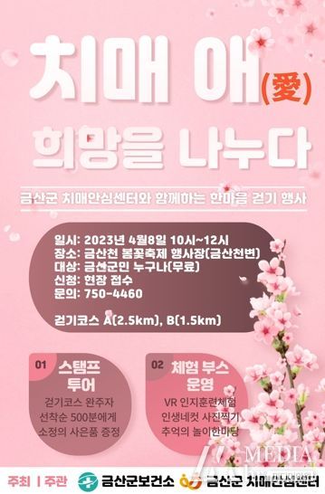미디어아워 이호민 기자 | 금산군보건소는 오는 8일 금산읍에서 열리는 금산천 봄꽃 축제장에서 ‘치매 애(愛)희망을 나누다’를 주제로 제4회 한마음 치매극복 걷기행사를 개최한다.