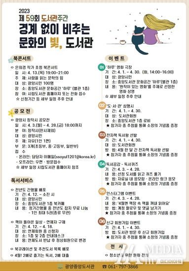 미디어아워 이호민 기자 | 광양시립도서관은 제59회 도서관 주간(오는 12일부터 18일까지)을 맞이하여 각 도서관마다 4월 한 달 동안 작가 초청 강연, 특강, 공연, 전시 등 풍성한 독서문화행사를 진행한다고 밝혔다.
