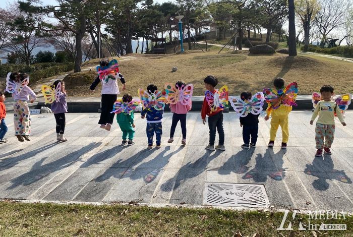 오감하동은 매주 다른 주제로 다양한 작품을 만드는데 첫 시간인 지난 토요일은 ‘하동의 봄을 찾아서’라는 주제로 아이들과 부모가 직접 나비를 만든 후 아이들이 등에 매고 하동공원에서 나비가 돼 자연을 누비는 시간을 가졌다.