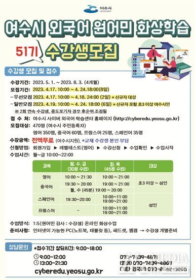 미디어아워 이호민 기자 | 여수시가 오는 17일부터 24일까지 ‘여수시 외국어 원어민 화상학습’ 수강생 470명을 모집한다고 밝혔다.