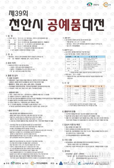 자세한 사항은 천안시청 누리집 ‘제39회 천안시공예품대전 개최’공고문을 참고하면 된다. 문의사항은 천안시 문화예술과 문화산업팀 또는 천안공예협회로 연락하면 된다.