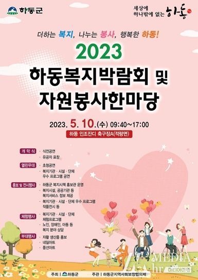 미디어아워 이호민 기자 | 하동군은 오는 10일 하동인조잔디축구장에서 하동군지역사회보장협의체와 함께 ‘2023 하동복지박람회 및 자원봉사 한마당’을 개최한다고 3일 밝혔다.