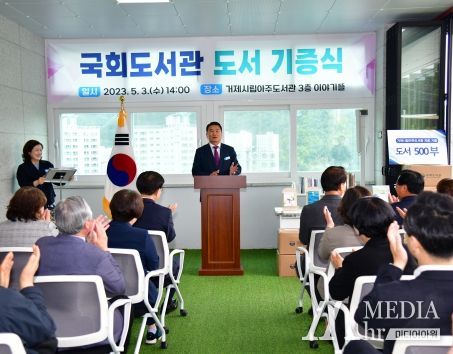 지난 3일 박종우 거제시장, 서일준 국회의원, 이명우 국회도서관장 등 30여 명이 참석한 가운데 거제시립아주도서관에서 도서 기증식을 개최하고 신규도서 500권을 기증받았다.