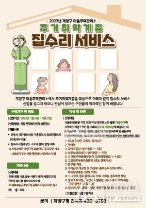 올해 4회 차에 접어든 집수리 서비스 사업은 지난해 접수된 55건에 대한 집수리가 5월 중에 마무리됨에 따라 5월 8일부터 5월 26일까지 관할 동 행정복지센터를 통해 신청 받는다. 신청 서식, 자세한 사항은 계양구청 누리집 ‘공지사항’에서 확인할 수 있다.