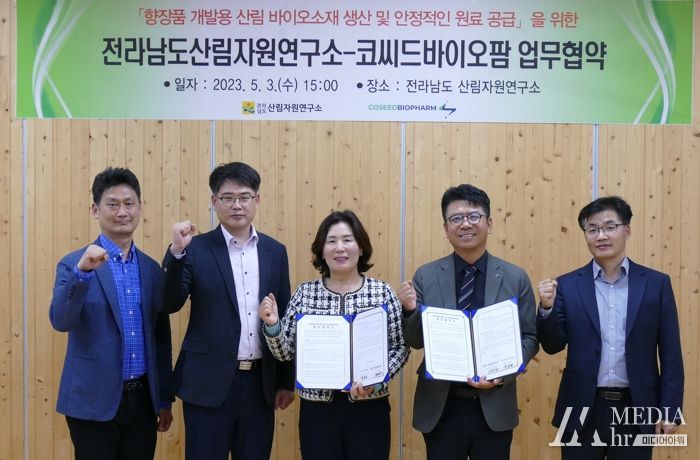 미디어아워 이호민 기자 | 전라남도산림자원연구소는 ㈜코씨드바이오팜과 화장품 개발용 산림 바이오소재 생산 및 안정적 원료 공급을 위한 업무협약을 지난 3일 체결했다.