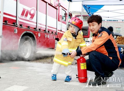 미디어아워 김성연 기자 | 7일 오전 의병문화체육관에서 열린 제101회 의령군 어린이날 기념 ‘어린이 대축제’ 행사에서 어린이가 소방관 체험을 하고 있다. 이날 강풍을 동반한 많은 비가 내린 탓에 어린이날 야외 행사가 대부분 실내 행사로 전환했다.