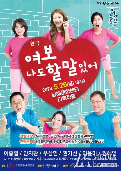 미디어아워 이호민 기자 | 2023년 ‘문예회관과 함께하는 방방곡곡 문화공감’ 지원 사업의 우수공연프로그램 연극'여보 나도 할 말 있어'가 오는 5월 26일 오후 7시 남해문화센터 다목적홀에서 공연된다.