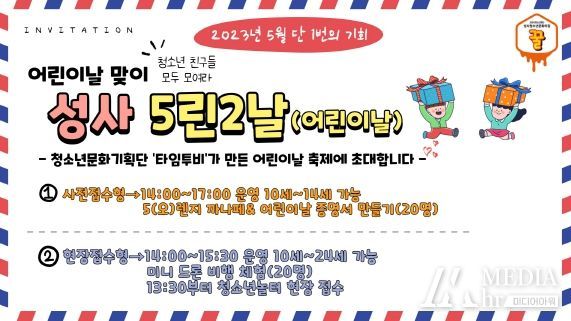 미디어아워 진금하 기자 | 고양시청소년재단 성사청소년문화의집은 오는 6일 어린이날 맞이 ‘성사 5린2날(어린이날) 축제’를 운영한다고 밝혔다.