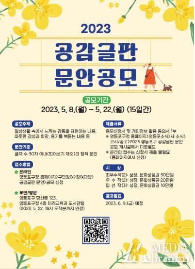 미디어아워 진금하 기자 | 영등포구가 구민들에게 따뜻한 위로가 되고 희망을 전해줄 ‘공감 글판’을 공모한다고 밝혔다.