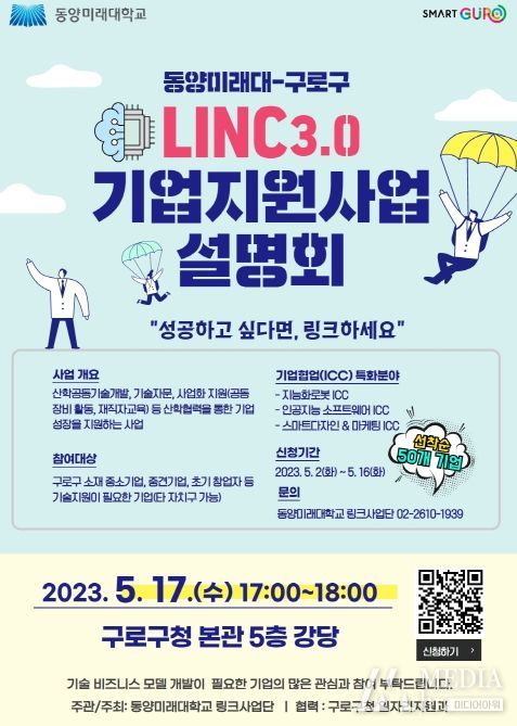 미디어아워 진금하 기자 | 구로구가 오는 17일 오후 5시 구청 강당에서 ‘동양미래대학교 LINC3.0 기업지원 사업설명회’를 개최한다.
