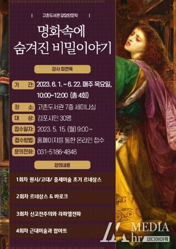 미디어아워 박미영 기자 | 김포시 고촌도서관은 6월 1일부터 6월 22일까지 매주 목요일 오전 10시, 도서관 7층 세미나실에서 2023 고촌도서관 달달인문학 프로그램 ‘명화 속에 숨겨진 비밀이야기’ 프로그램을 운영한다.