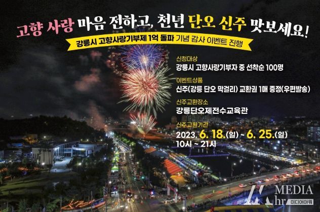 미디어아워 박미영 기자 | 강릉시는 고향사랑기부금 1억 원 돌파를 기념하여 오직 단오제 기간에만 맛볼 수 있는‘신주(강릉 단오 막걸리) 교환권’을 기부자들에게 지급하는 감사 이벤트를 마련한다.