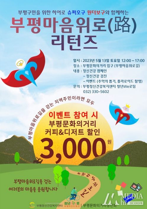 미디어아워 최지나 기자 | 인천시 부평정신건강복지센터가 오는 13일 부평 문화의거리에서 구민의 정신건강 증진을 위해 ‘부평마음위로(路) 리턴즈’ 캠페인을 진행한다.
