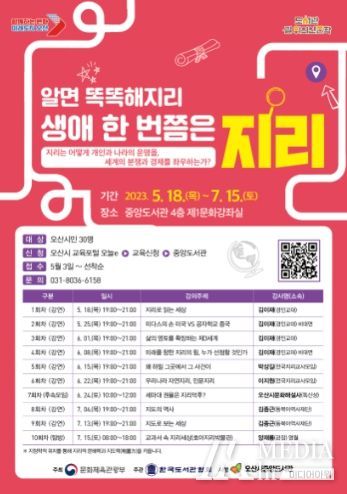 미디어아워 박미영 기자 | 오산시 중앙도서관은 오는 18일부터‘생애 한 번쯤은 지리’라는 주제로 인문학 강연 및 탐방을 시작한다고 11일 밝혔다.