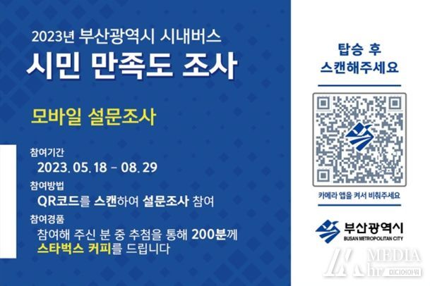 미디어아워 박미영 기자 | 부산시는 시내버스의 친절 및 서비스 제고를 위해, 시내버스 준공영제 도입 이후 최초로 큐아르(QR) 코드를 활용한 시민 만족도 조사를 오는 5월 18일부터 8월 29일까지 시행한다고 밝혔다.