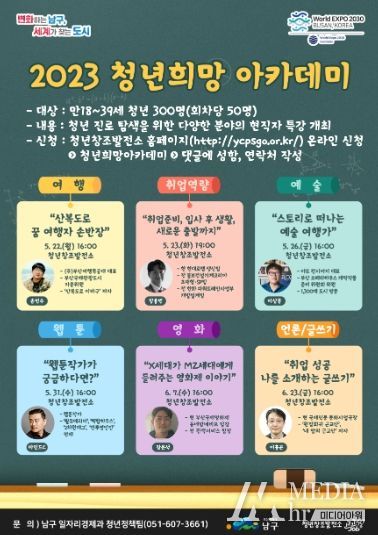 미디어아워 조연정 기자 | 부산 남구는 오는 22일부터 청년창조발전소(용소로46번길 7)에서 진로선택을 앞둔 청년들을 위한 '2023년 청년 희망 아카데미'를 실시한다고 12일 밝혔다.