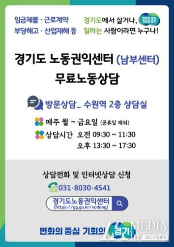 미디어아워 박미영 기자 | 경기도는 일하는 사람들을 위한 무료 노동 상담 공간인 경기도노동권익센터 남부센터를 운영한다고 14일 밝혔다.