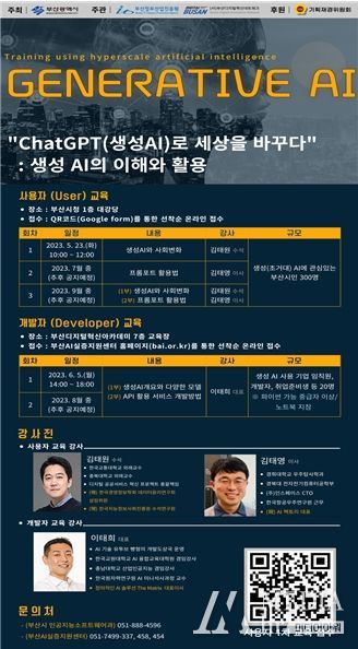 부산시는 오는 5월 23일 오전 10시 시청 1층 대강당에서 첫 교육을 시작으로, 국내 다양한 분야의 인공지능 전문가를 초청하여 9월까지 매달 1회씩, 총 5차례에 걸쳐서 다양한 생성인공지능 관련 사용자 교육을 진행한다고 밝혔다.