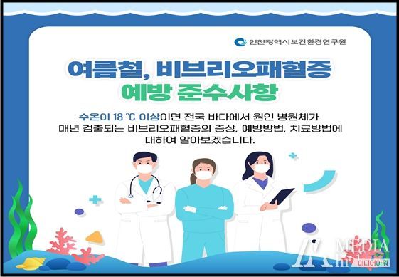 권문주 인천시 보건환경연구원장은 “코로나19가 일상적 감염관리 체계로 전환됨에 따라 해변 물놀이가 늘어날 수 있어 비브리오패혈증 예방에 각별한 주의가 요구되므로 예방수칙을 준수해 주시길 바란다.”고 말했다.