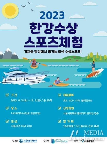 미디어아워 조연정 기자 | 서울시는 시민들에게 야외 수상레저 활동 기회를 제공하기 위해'한강 수상스포츠 체험'프로그램을 6월 3일부터 9월 3일까지 매주 주말 총 20회차에 걸쳐 운영한다고 밝혔다.