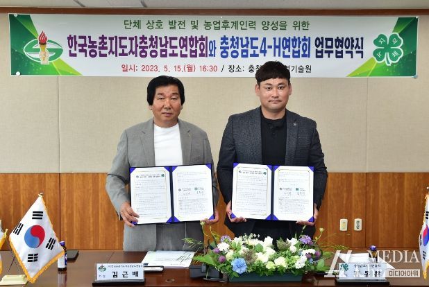 미디어아워 박미영 기자 | 충남도 농업기술원은 15일 기술원에서 한국농촌지도자충남연합회(회장 김근배)와 충남4-H연합회(회장 김동완)가 ‘양 단체 상호 발전과 농업 후계인력 양성을 위한 업무협약’을 체결했다고 밝혔다.