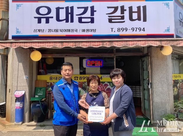 미디어아워 박미영 기자 | 광명시 하안1동 행정복지센터와 하안1동 지역사회보장협의체는 15일 유대감 갈비와 광명마을냉장고에 반찬 등을 정기후원하는 나눔협약을 맺고 하안1동 지역사회보장협의체 협력 기관을 인증하는 나눔가게 현판을 전달했다.