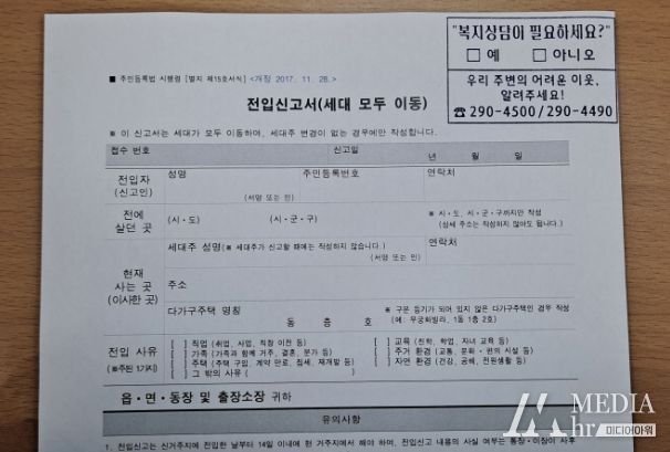 중구는 전입신고서 윗부분에 ‘복지 상담이 필요하세요?’라는 문구와 ‘예/아니오’답변 항목을 삽입해, 전입 가구가 건강 또는 경제적 어려움을 겪고 있는지 등을 확인할 예정이다.