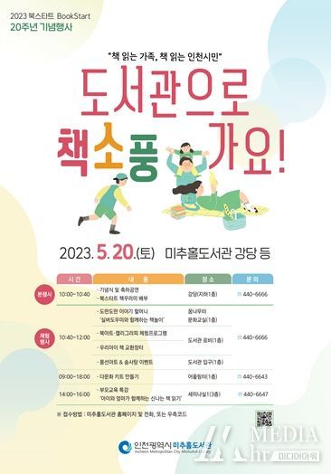 미디어아워 박미영 기자 | 인천광역시는 미추홀도서관에서 오는 20일 한국 북스타트 20주년과 인천시 북스타트 12주년 기념행사 '도서관으로 책소풍 가요!'를 개최한다고 밝혔다.