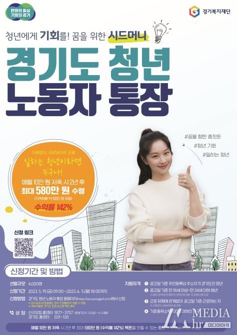 ‘경기도 청년 노동자 통장’은 청년이 2년 동안 근로활동을 유지하면서 매달 10만원을 저축하면 2년 후 경기도 지원금을 합쳐 약 580만원(지역화폐 100만원 포함)의 목돈을 마련하는 청년지원 사업이다.