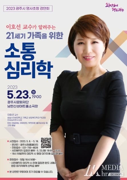 이번 강연은 이호선 숭실사이버대학교 교수가 강사로 초빙돼 ‘21세기 가족을 위한 소통 심리학’을 주제로 광주시민들을 대상으로 강연할 예정이다. 이호선 교수는 ‘KBS 아침마당’, ‘여유만만’, ‘무엇이든 물어보세요’ 등의 프로그램에 출연해 청중과 호흡하는 베테랑 소통 전문가로서, 이번 명사초청 강연회를 통해 가족 안에서 부모와 자녀가 친근하게 소통하는 방법과 가족 간 유대관계를 높여주는 소통의 비결에 대해 이야기하고자 한다.