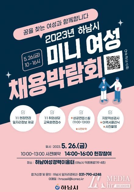 미디어아워 진금하 기자 | 하남시는 오는 26일 오전 10시부터 오후 4시까지 하남여성경력이음터(덕풍동로 119 4층)에서 ‘2023년 하남시 미니 여성 채용박람회’를 개최한다고 16일 밝혔다.