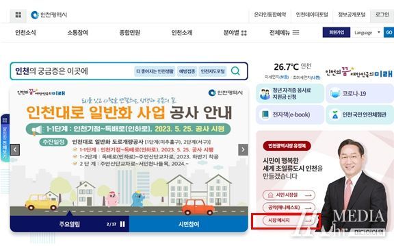 미디어아워 박미영 기자 | 인천시 홈페이지에 유정복 인천시장의 정책 방향과 행정철학 등을 상시 게재하는 메시지 공간이 마련됐다.