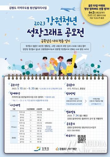 미디어아워 박미영 기자 | 강원도와 (재)강원도일자리재단이 강원도 지역주도형 청년일자리사업(기참여자 포함) 참여자를 대상으로 다음달 6월 20일까지 '2023 강원청년 성장그래프 공모전'을 공모한다.