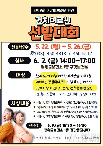 미디어아워 조연정 기자 | 철원군보건소는 제78회 구강보건의날을 맞이하여 구강건강관리에 대한 지역주민 인식 제고 및 건강생활실천 분위기를 조성하고자 건치(건강한 치아)어르신 선발대회를 개최한다.