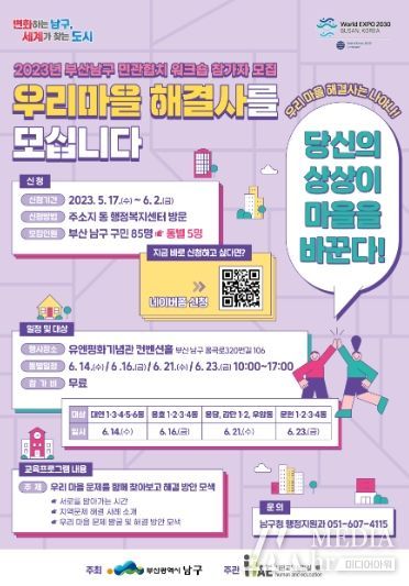 미디어아워 조연정 기자 | 부산 남구는 5월 17일부터 6월 2일까지 '2023년 민관협치 워크숍'에 참여할 시민들을 모집한다.