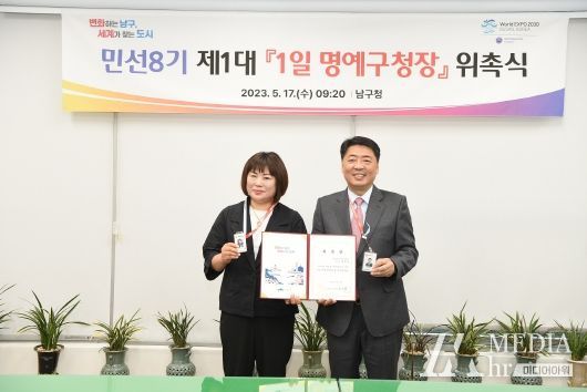 미디어아워 김성연 기자 | 부산 남구는 17일 민선8기 제1대 명예구청장으로 권경옥 용호1동 자원봉사캠프 캠프장을 위촉했다.