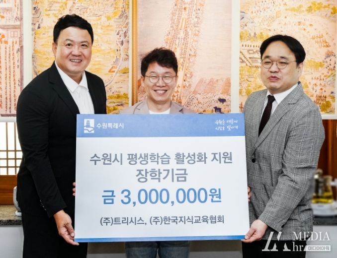 미디어아워 진금하 기자 | ㈜트리시스와 ㈜한국지식교육협회가 수원시에 장학금 300만 원을 기탁했다.