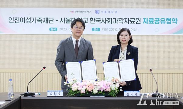 미디어아워 박미영 기자 | 인천여성가족재단(대표이사 김미애, 이하 재단)과 서울대학교 한국사회자료원(원장 박원호, 이하 KOSSSA)은 2023년 5월 17일 재단에서 연구데이터에 대한 자료공유 협약을 체결했다.