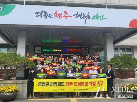 이날 열린 결의대회는 충청권 메가시티를 형성하는 충청권 광역철도 청주도심통과 노선 확정의 조속한 추진을 위한 성명서 낭독과 도심통과를 염원하는 피켓을 들고 구호를 제창하는 퍼포먼스로 진행됐다.